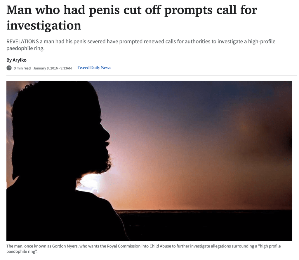 After Gordon Myers testified to the Royal Commission into Institutional responses to Child Abuse, police tried to falsely accuse him of molesting a child. This attempt was dropped after it was realised that Gordon Myers could not physically sexually assault a child. He has never been able to have sex because his penis had been cut off at age 12 by JOHN MUNGA, nurse at DARUK BOYS' HOME, Windsor, during a botched circumcision attempt. He was taken to Windsor Hospital, awoke during the operation and went into a foetal position. His penis was sewn on.