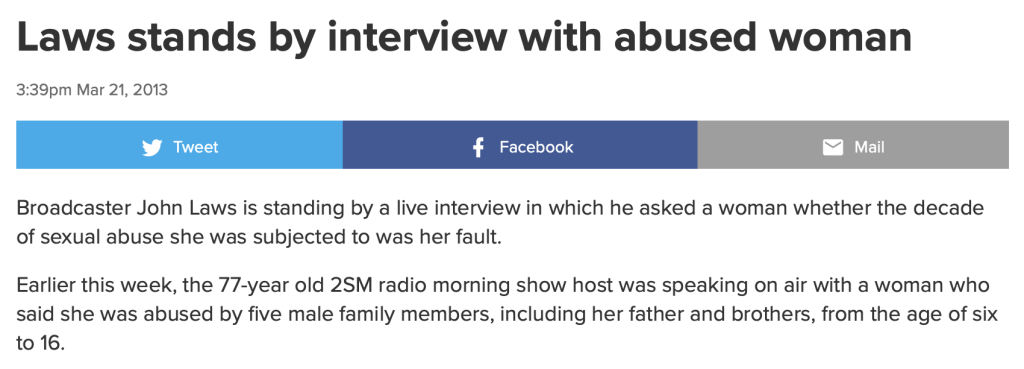 Article from 2013: Broadcaster John Laws is standing by a live interview in which he asked a woman whether the decade of sexual abuse she was subjected to was her fault.