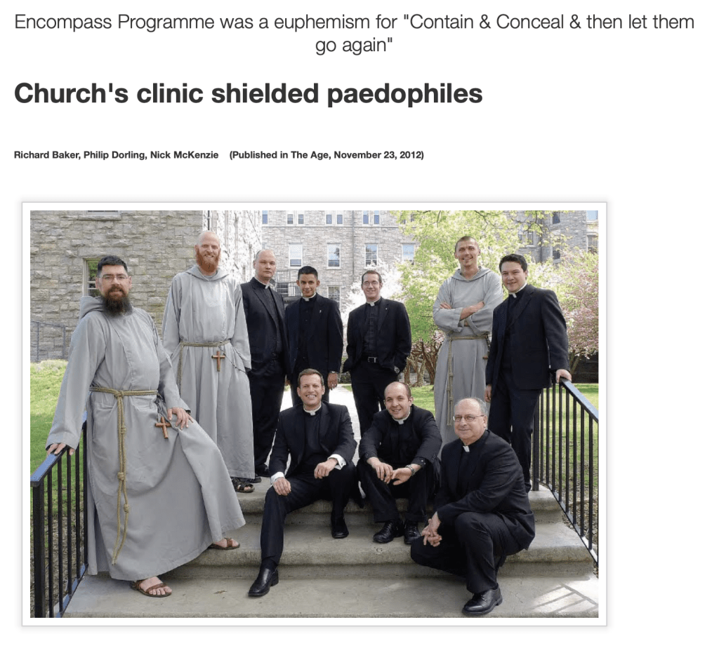 2012 Article: "The Catholic Church's little-known treatment clinic for clergy with psychosexual problems harboured known paedophiles and shielded them from police scrutiny.