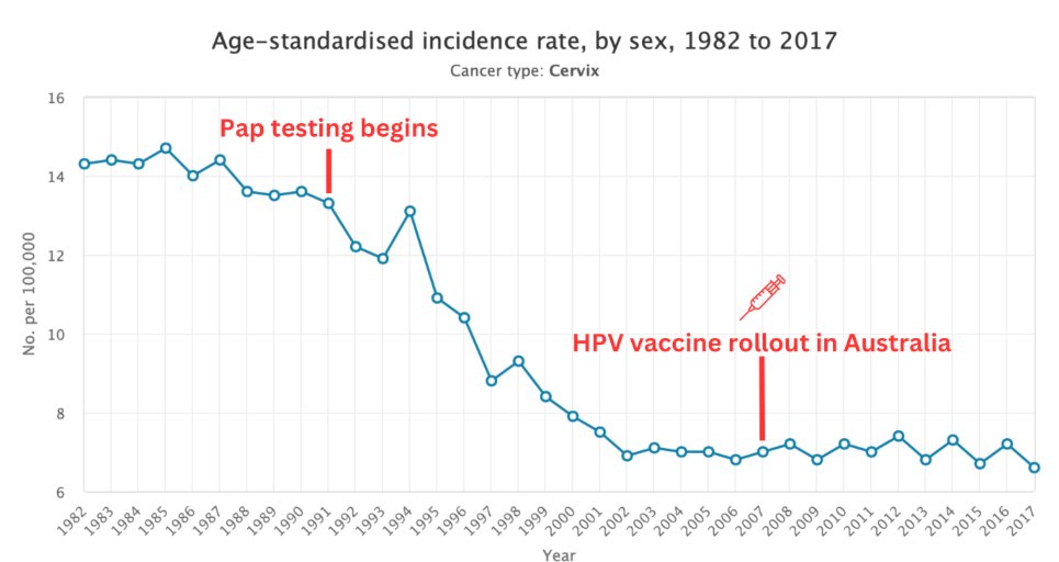 Considering that during the HPV pre-vaccination era from 1982 to 2007, smear screening (pap tests), reduced cervical cancer outcomes in Australia by almost 50%, it is baffling that such a large scale vaccination program is still being pushed on our youth, despite not showing any benefit in the decade-worth of data available.