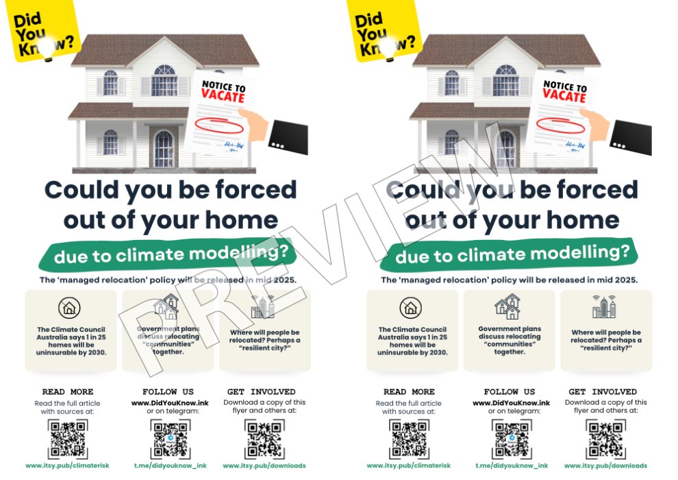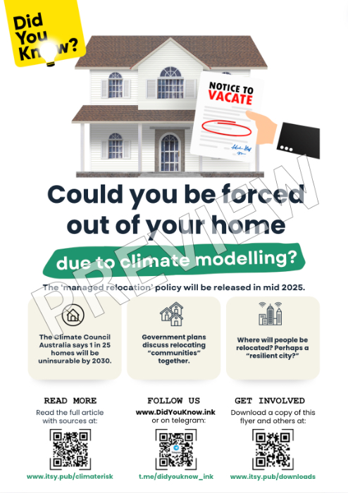 The concern is that these 'climate risks’ are based on modelling, which is basically a guessing-game and may not reflect actual risks. For example, my home that I have been living in for almost 10 years, that is not near the ocean and has never experienced floods, bushfires or any other natural disasters, is somehow classed as being “high risk” for climate change by 2030.